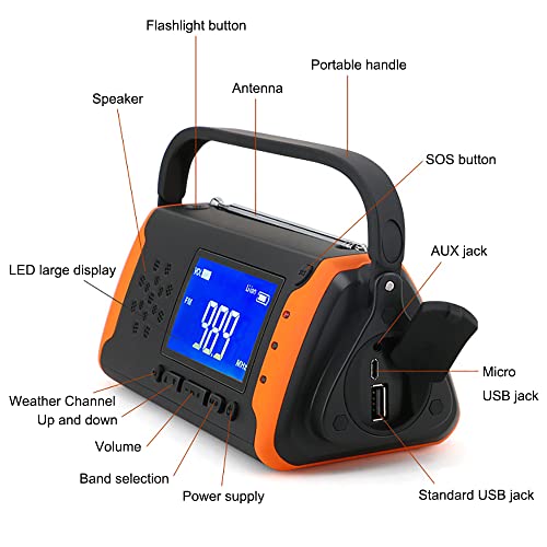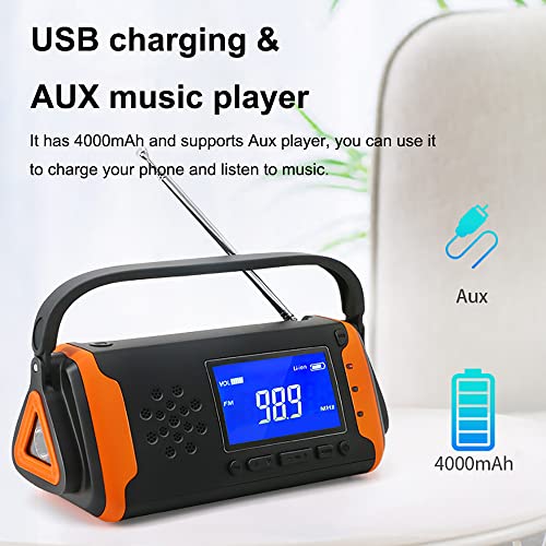 【Lange stand-by】 Een 4000mAh Power Bank laadt uw telefoon op in een noodsituatie of ramp. Tijdens een power cut biedt de volledig noodweerradio tot 18-20 uur zaklantaarn of 18-20 uur radio-afspelen (afhankelijk van het geluidsvolume) of 30-35 uur van Aux Music Play, laat u uit de donker en zich niet vervelen ..