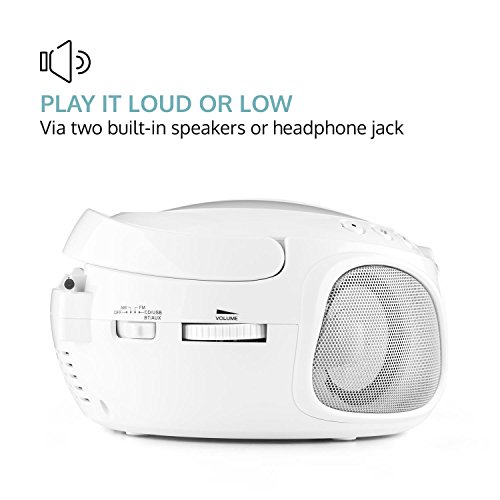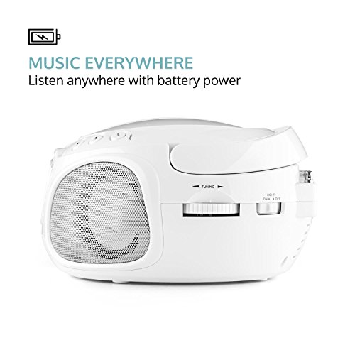 auna Roadie – CD-radio, stereo, boombox, USB, MP3, FM-radiotuner, Bluetooth 2.1, LED-verlichting, 2 x 1,5 W RMS-voeding, netvoeding en batterijvoeding, wit