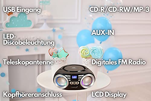 Specification: Draagbare cd-speler | led-discoverlichting | boombox | CD/CD-R | USB | FM-radio | AUX-ingang | hoofdtelefoonaansluiting | 20 geheugensleuven | kinderradio | CD-radio | compact systeem (zwart/zonnig